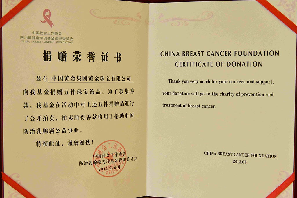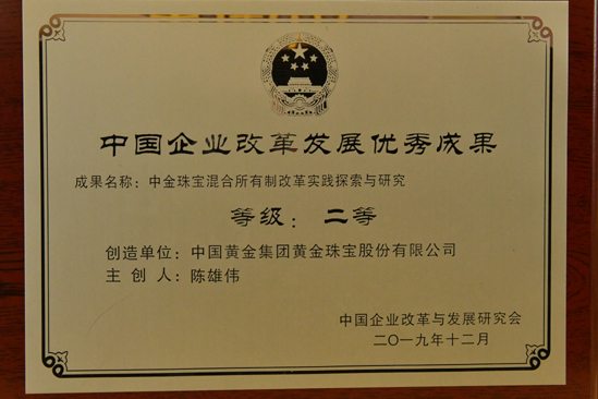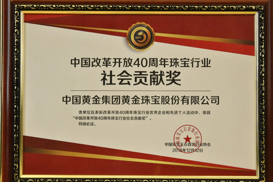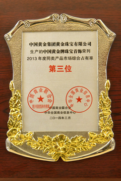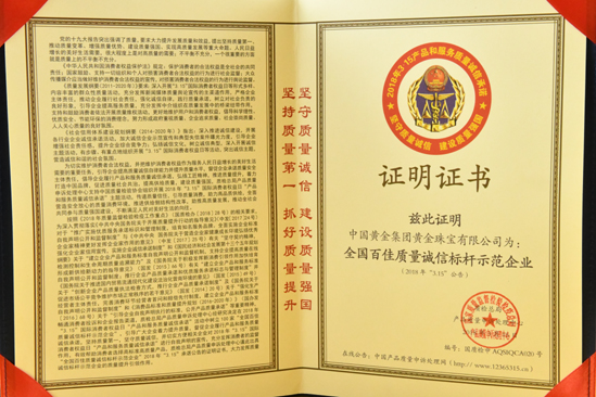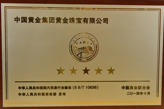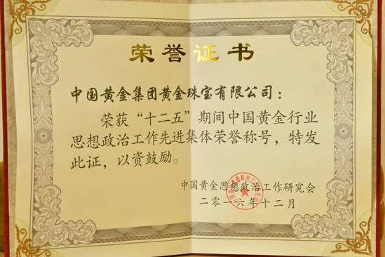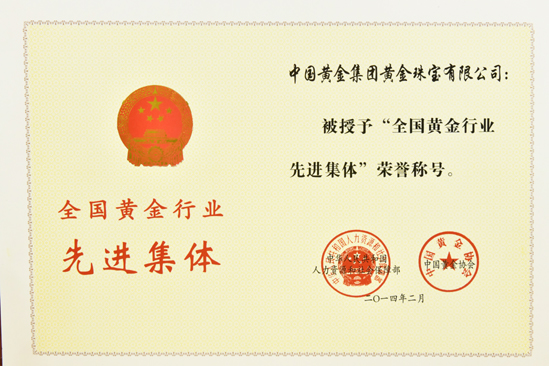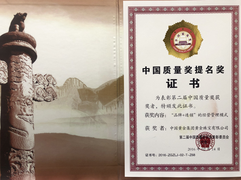 2012年被中国质量检验协会评为全国质量诚信承诺优秀示范企业。2012年3月15日中国黄金集团黄金珠宝有限公司荣获中国质量检验协会颁发的全国质量诚信承诺优秀示范企业奖。