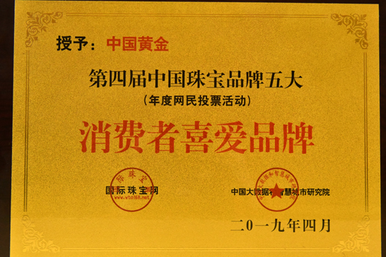 2015年,中国黄金被中国珠宝玉石首饰行业协会授予“2015年度中国黄金珠宝玉石首饰行业零售业十大品牌”。中国黄金集团黄金珠宝有限公司,科技奖项目名称“黄金珠宝电子交易平台”,荣获2015年度中国黄金协会科学技术奖壹等奖,获奖证书编号2015HJ012。
