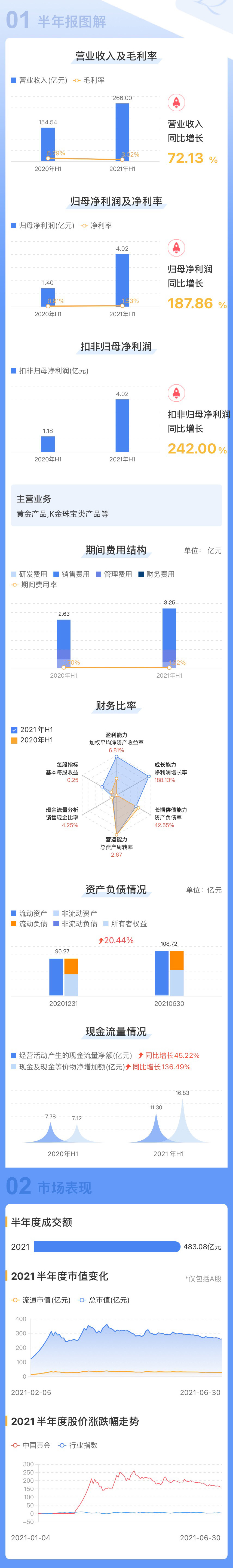 公告中显示,中国黄金2021年半年度实现营业收入266.00亿元,与上年同期相比,同比增加72.13%。净利润方面,公司 2021 年半年度归属于上市公司股东的净利润为4.02亿元,与上年同期相比,同比增加188%归属于上市公司股东的扣除非经常性损益的净利润为4.02亿元,与上年同期相比,同比增加242.00%。