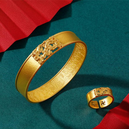 该套产品以武则天的人生经历为原型,向历史中的女神致敬,展现新时代女性独立、自主、勇敢、智慧的美好主张。 首饰采用手工錾刻锤碟纹,并嵌镂空如意祥云形龙纹浮雕,寓意龙佑吉祥,彰显权利和尊贵。手镯内侧铸刻武则天生平画,描写了武则天从出生、入宫、称帝、创字、万国来朝的人生轨迹及武则天自创的名字“曌”字(寓意日月当空)。戒口两边镂空万字纹,寓意万吉万福齐聚,内部铸刻“女王称帝”图。吊坠呈长方形,上刻武则天自创名字“曌”字,下钤武则天的“则天大圣皇帝”隶书玺印问,精致而古朴,体现了一代巾帼天骄的威严。